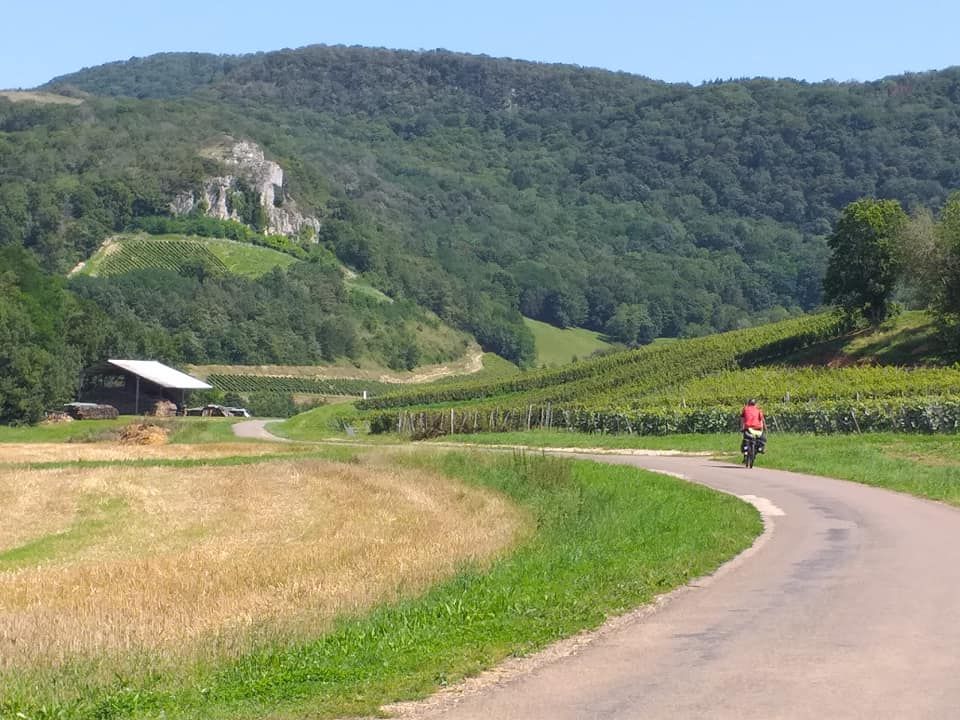 Its so very quiet and the cycling is easy, even the short gravel track was only a mild slope. The sun is hot and by midday we need shade and a cool down. Our wet neck buffs are dry. We spy a bench under some trees, park up and enjoy our food and the relative coolness. We lie down and could fall asleep but we don’t. We know the climb into the Jura is ahead of us, we can see the forested slopes. We have a choice, do we go into the town to find water or risk finding some in a village?